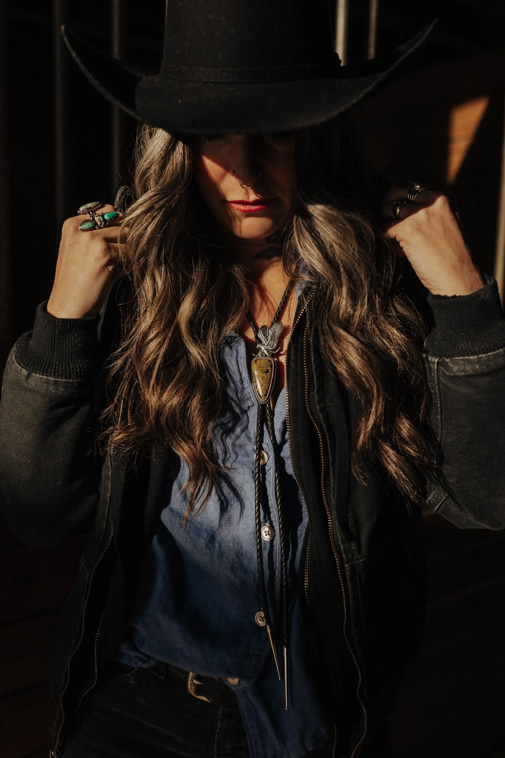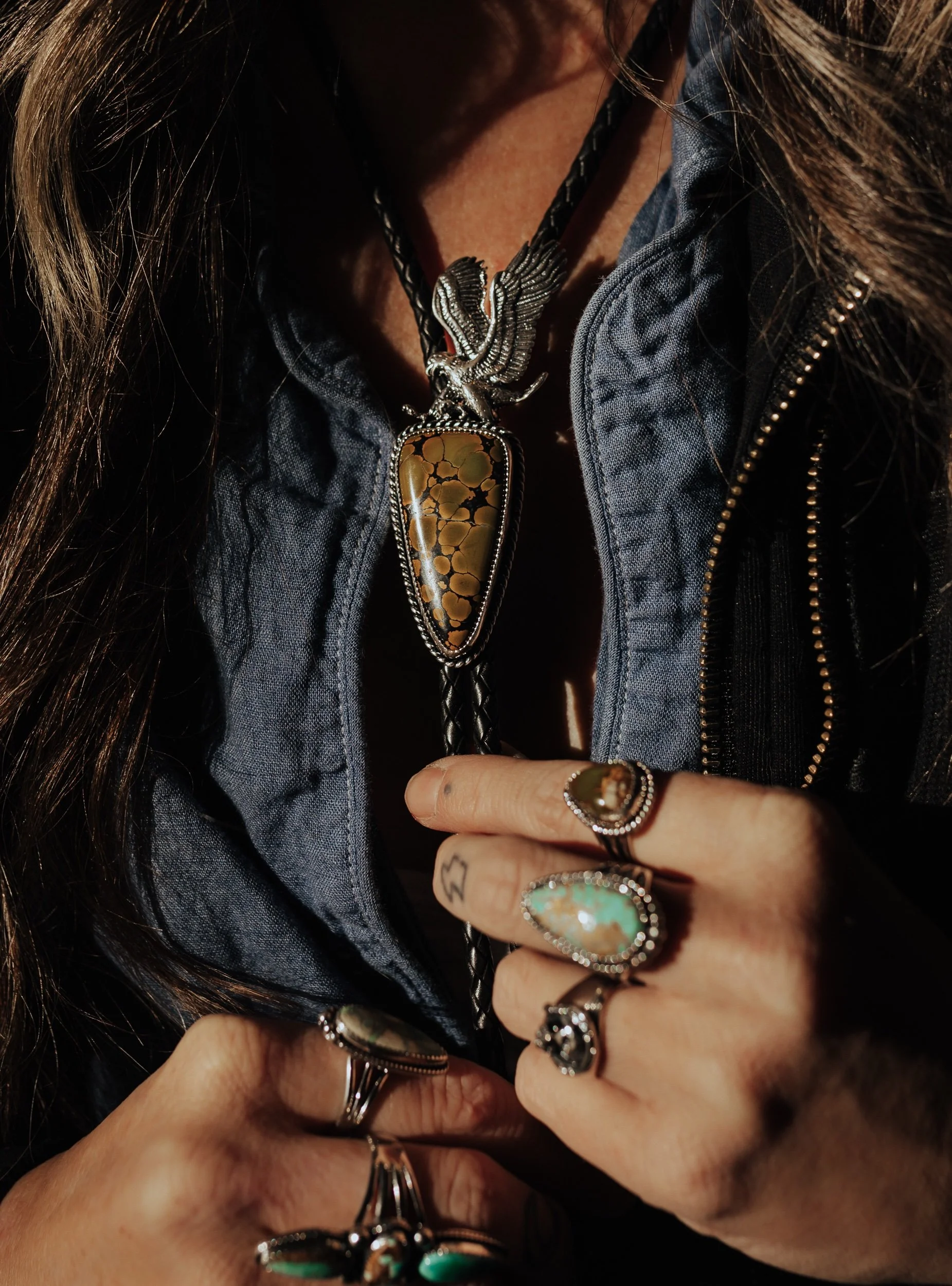 Handmade Bolo Tie with large sterling silver eagle and Royston Turquoise stone. Black 6 ply leather braided tie with sterling silver decorative tips.