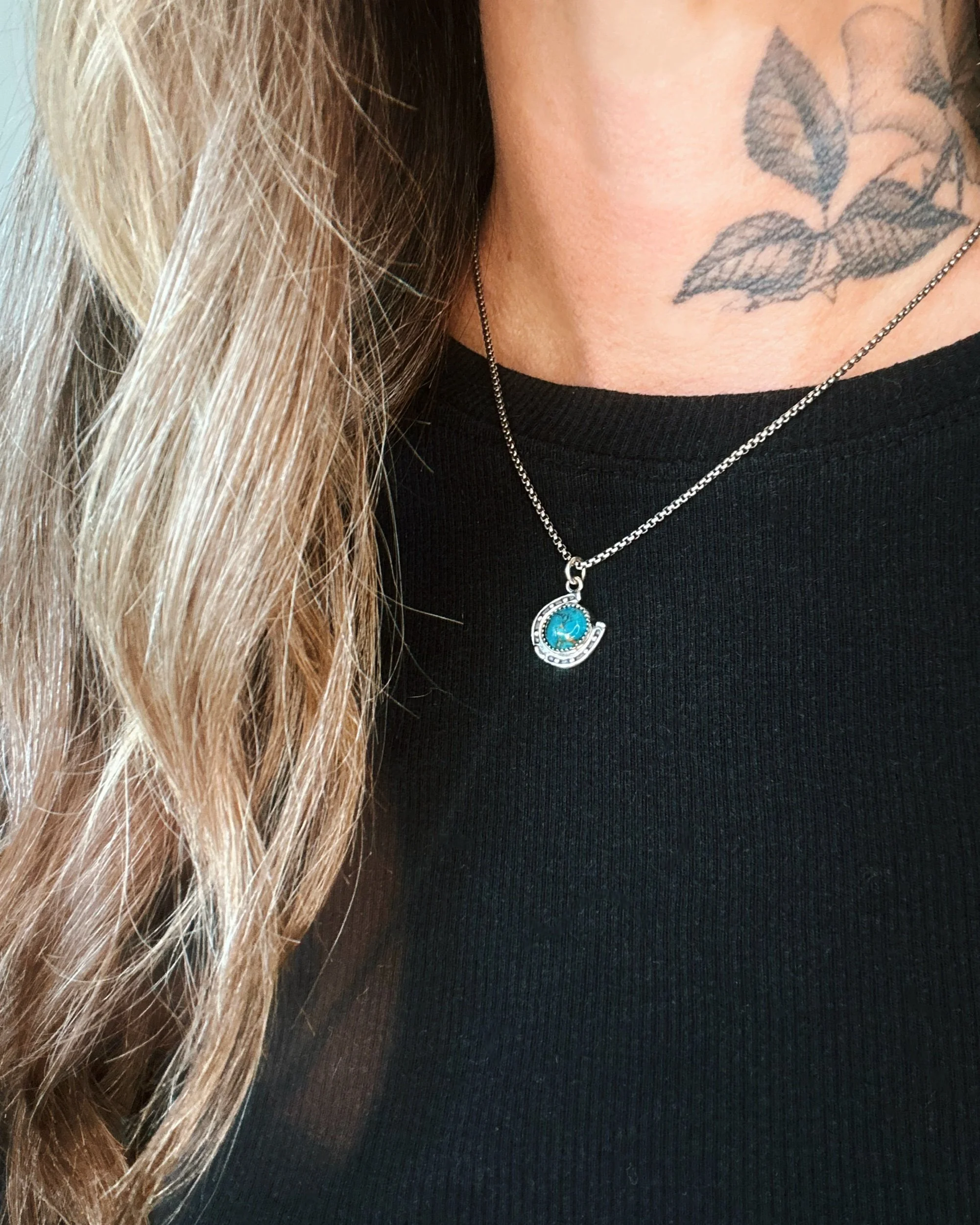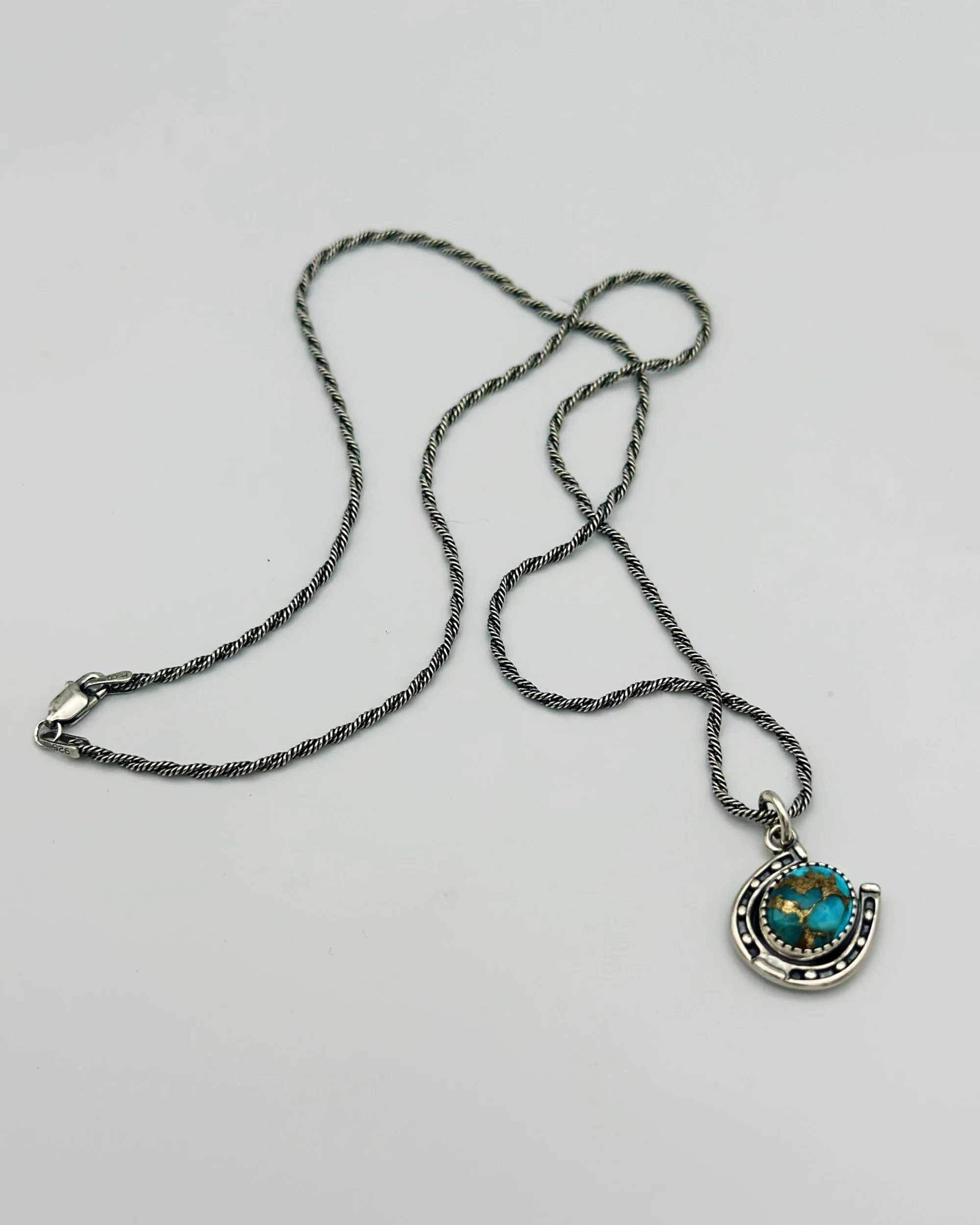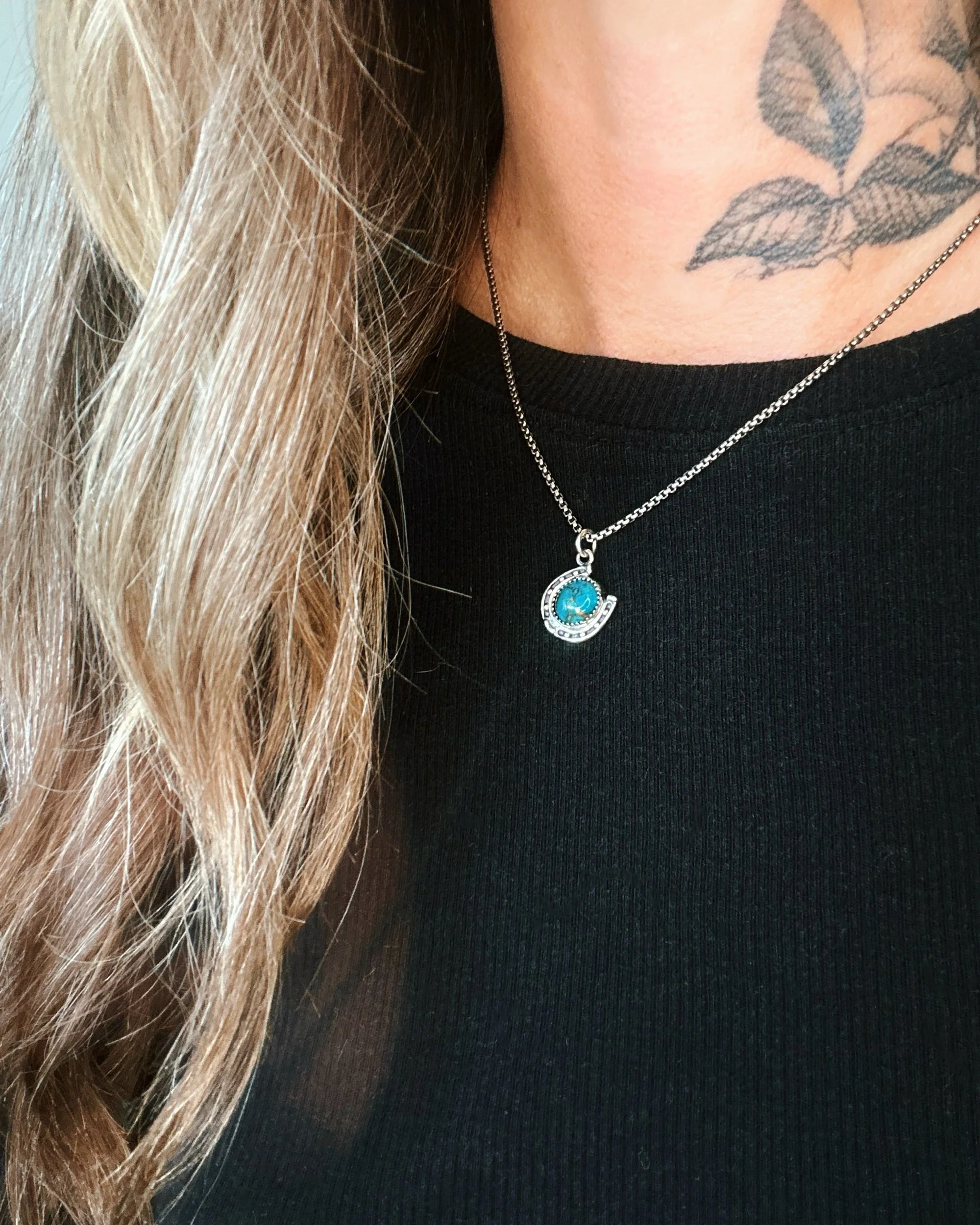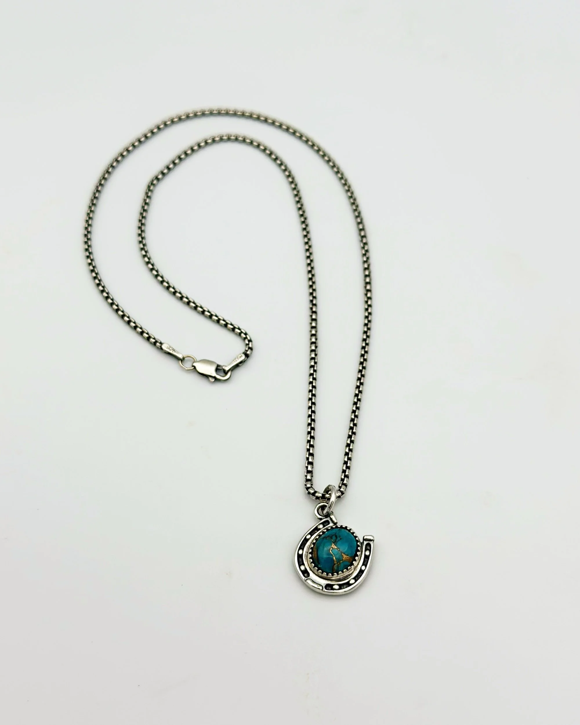 Handmade sterling silver lucky horse shoe chain necklace made with beautiful blue Turquoise stone.